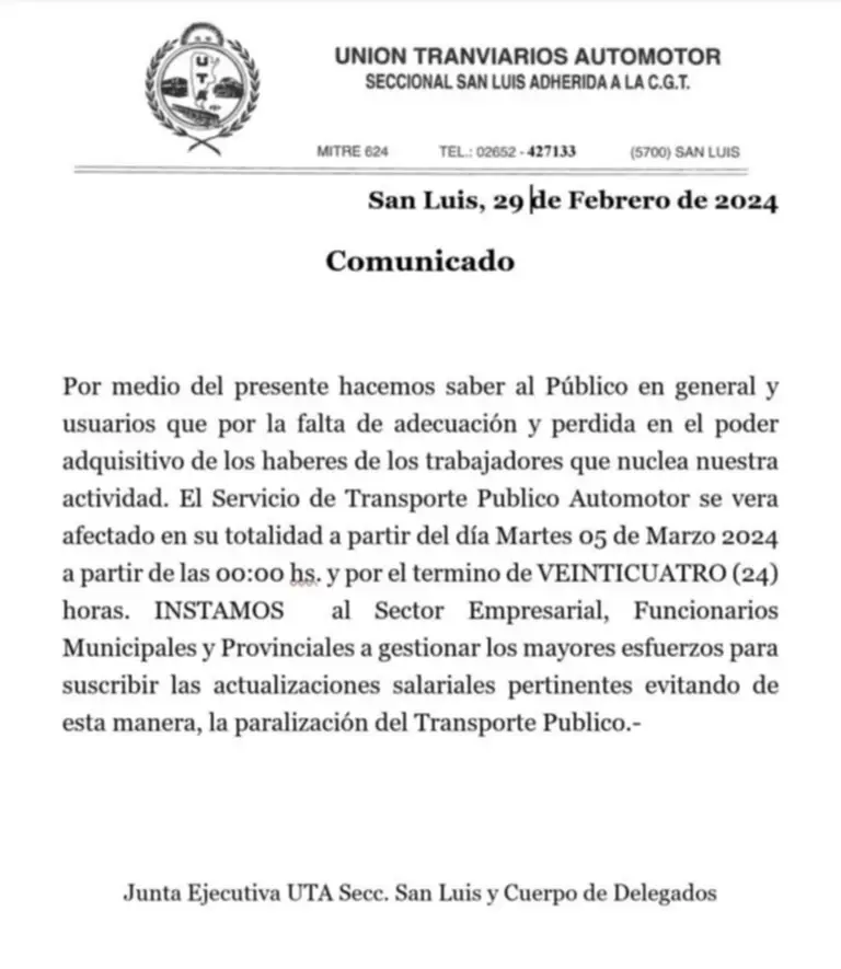 UTA San Luis confirmó que se suman a la medida nacional, dado que los empresarios de colectivos y el gremio no llegaron a un acuerdo salarial.